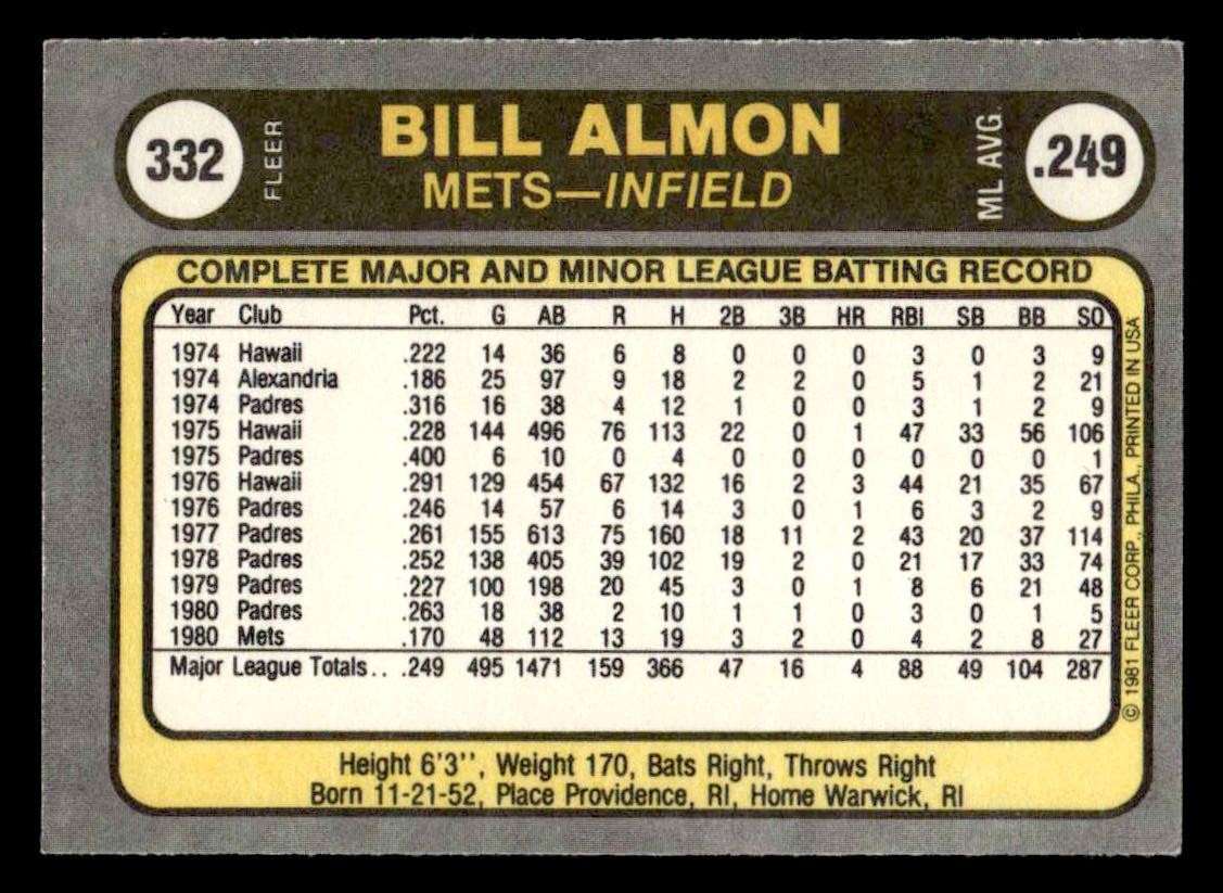 This is a nice example of a 1981 Fleer #332 Bill Almon