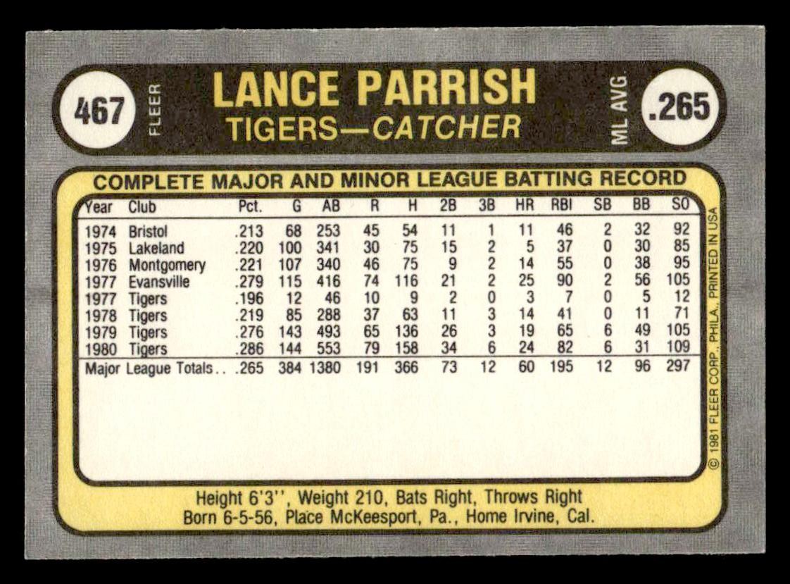 This is a nice example of a 1981 Fleer #467 Lance Parrish