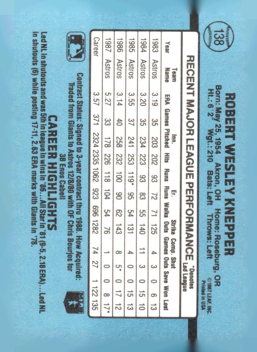 This is a nice example of a 1988 Donruss #138c Bob Knepper