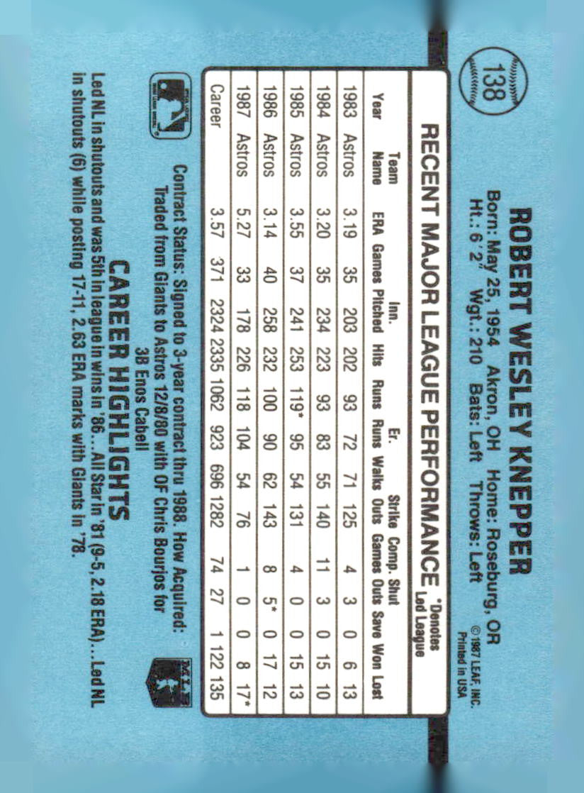 This is a nice example of a 1988 Donruss #138c Bob Knepper