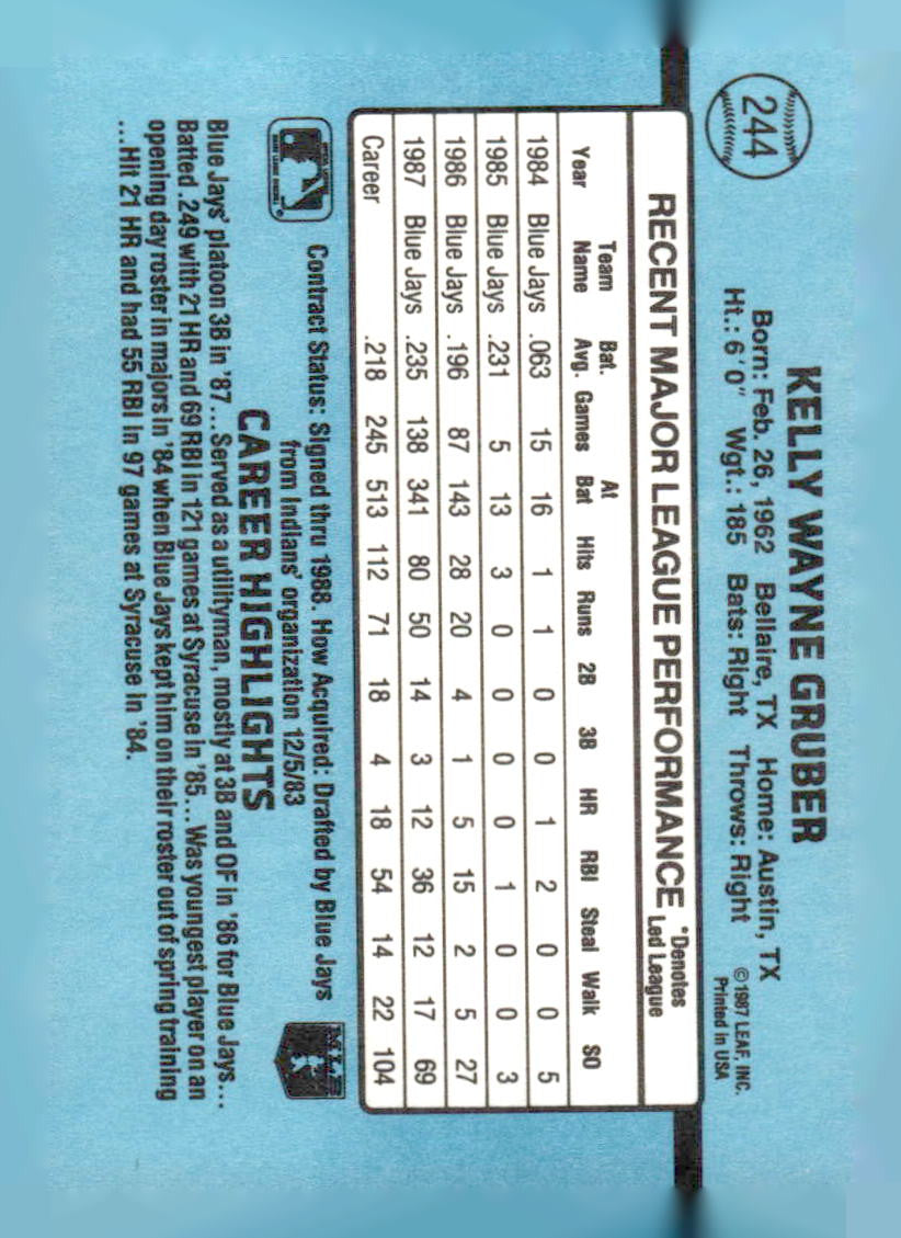 In 1988 Kelly Gruber played for the Toronto Blue Jays.