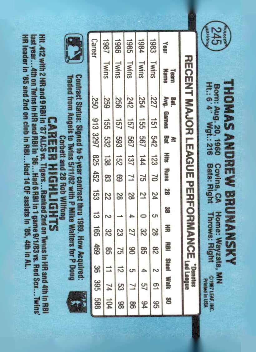 This is a nice example of a 1988 Donruss #245c Tom Brunansky