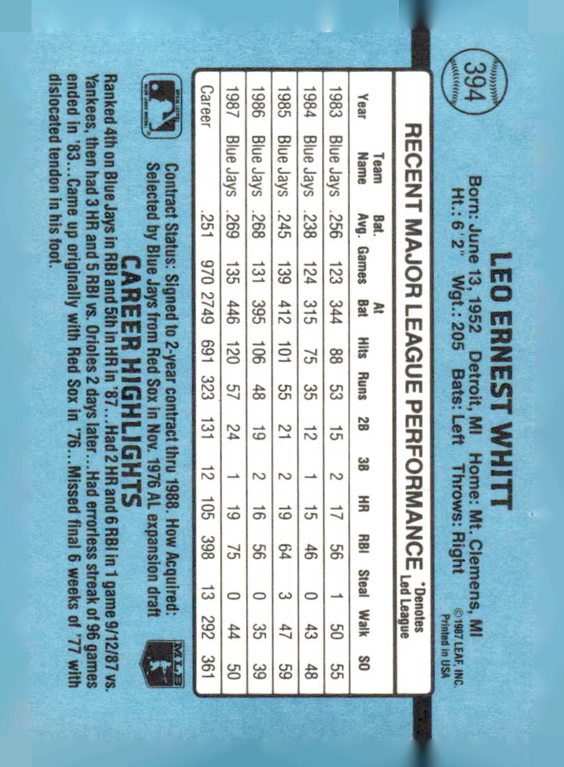 This is a nice example of a 1988 Donruss #394b Ernie Whitt