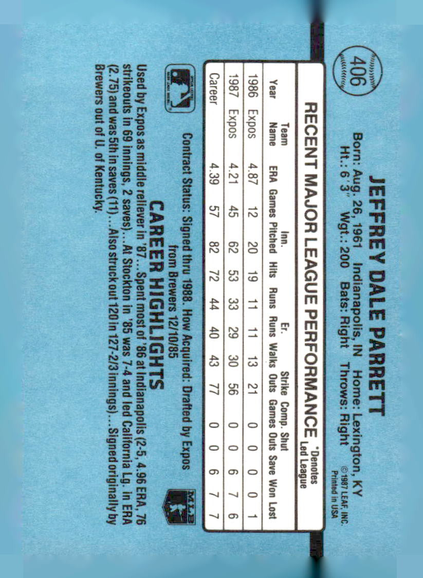 This is a nice example of a 1988 Donruss #406 Jeff Parrett