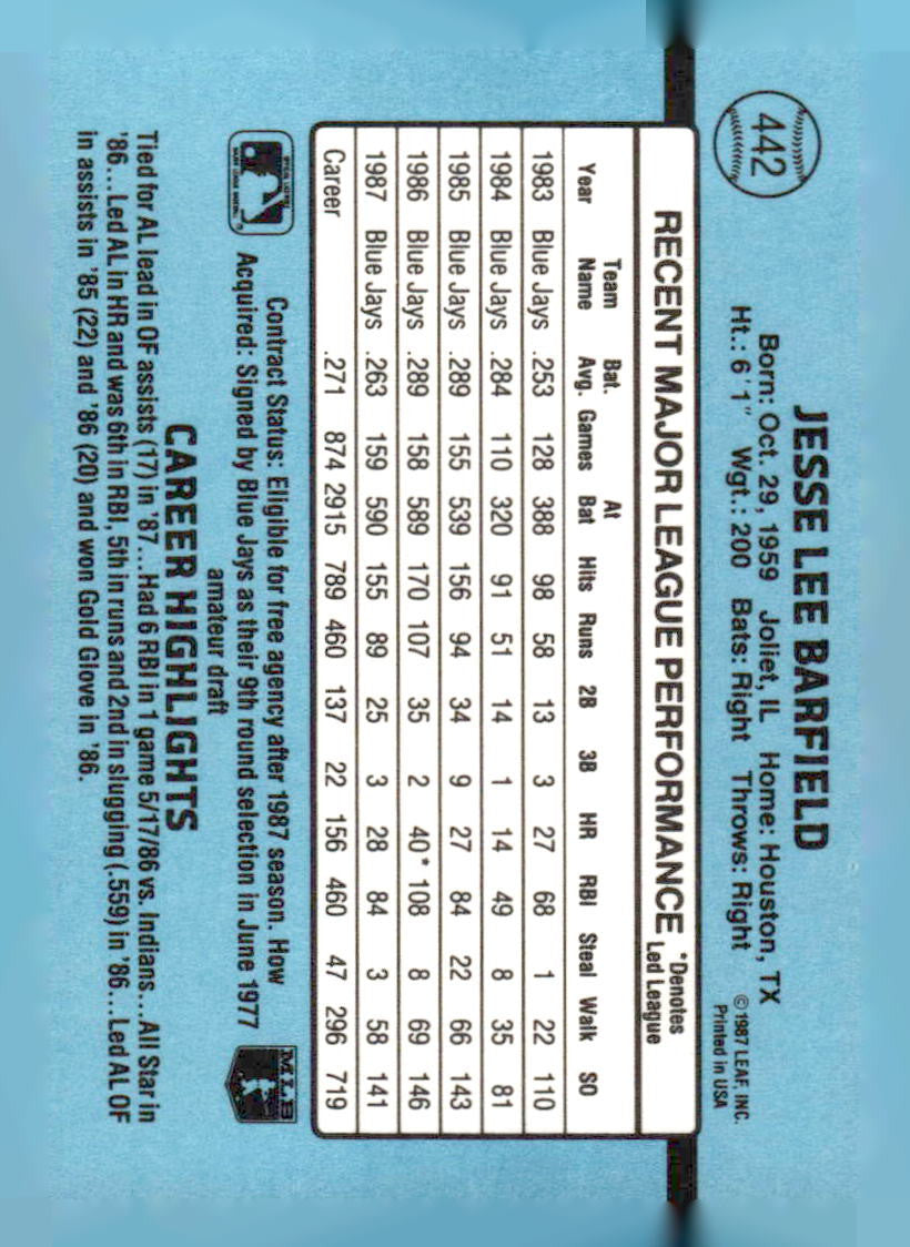 This is a nice example of a 1988 Donruss #442b Jesse Barfield