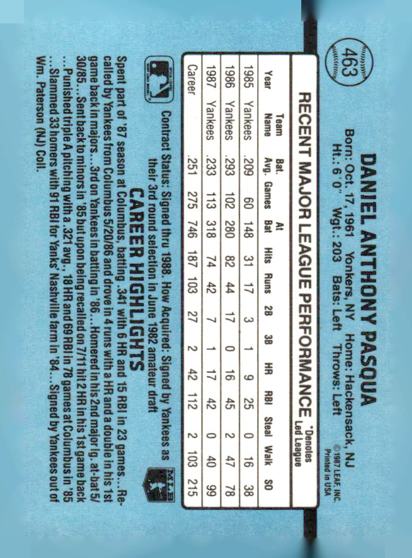 This is a nice example of a 1988 Donruss #463c Dan Pasqua