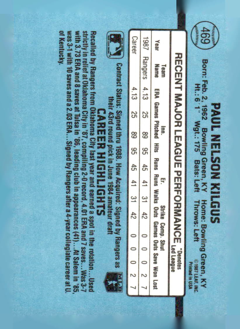 In 1988 Paul Kilgus played for the Texas Rangers.