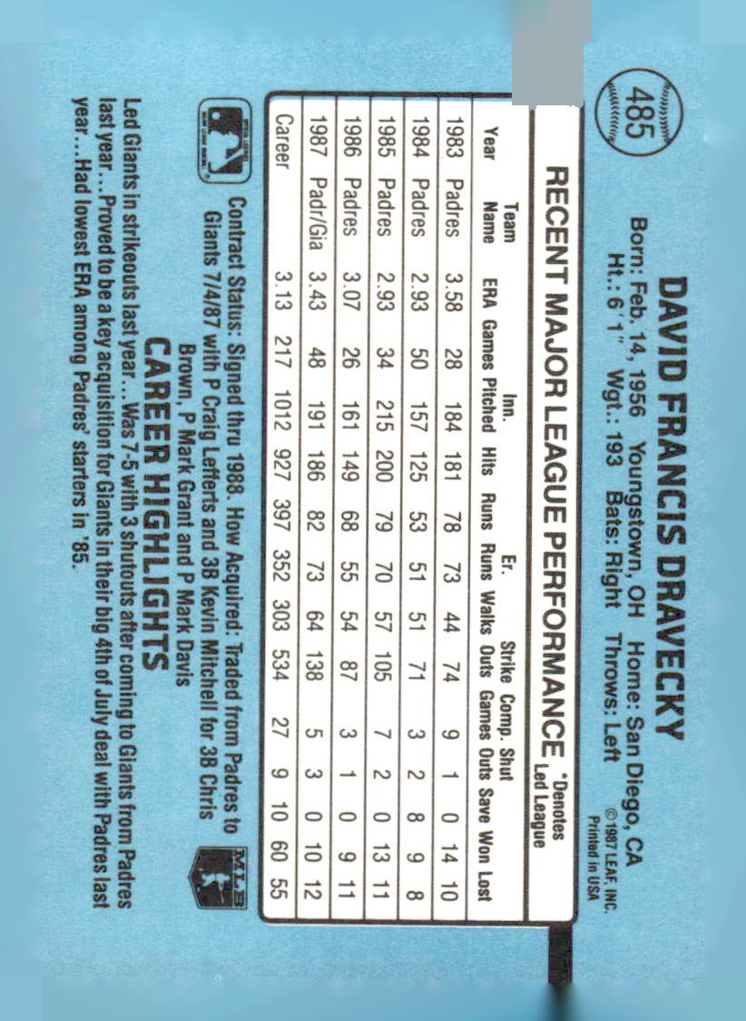 This is a nice example of a 1988 Donruss #485c Dave Dravecky