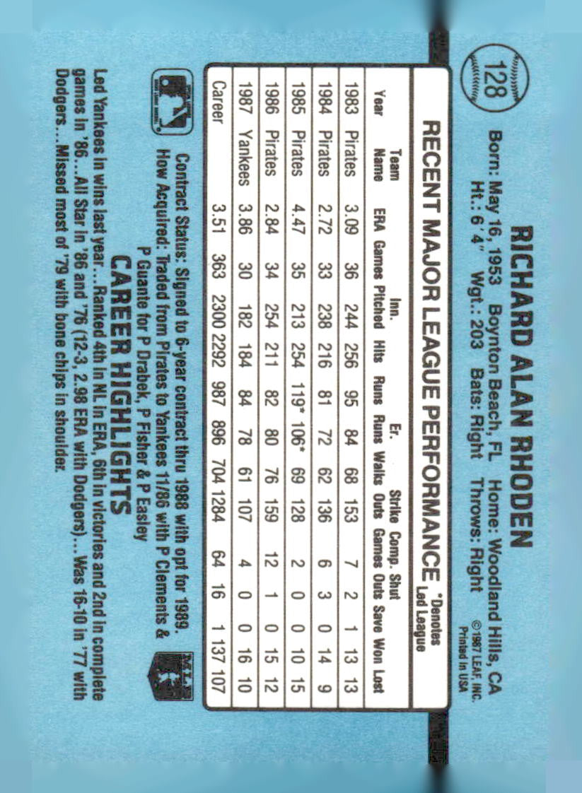 This is a nice example of a 1988 Donruss New York Yankees Team Collection #128 Rick Rhoden