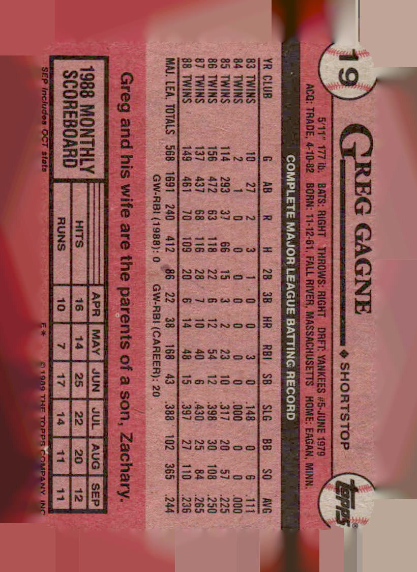 This is a nice example of a 1989 Topps #19 Greg Gagne