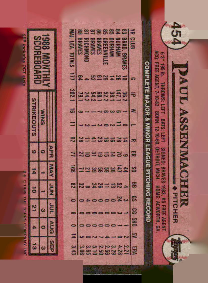 This is a nice example of a 1989 Topps #454 Paul Assenmacher
