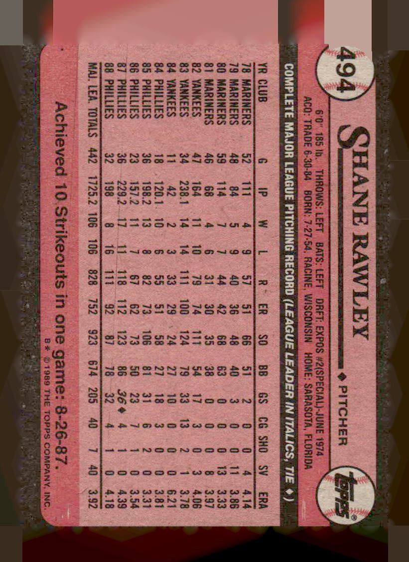 This is a nice example of a 1989 Topps #494 Shane Rawley
