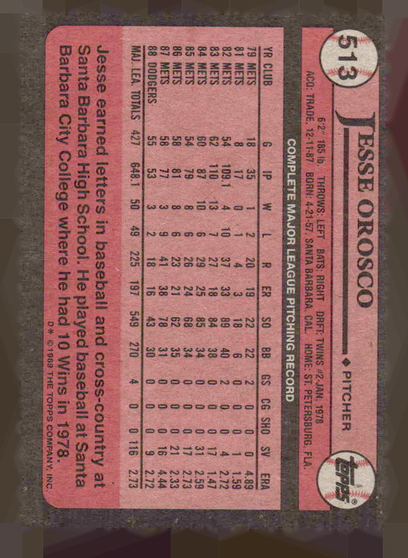 This is a nice example of a 1989 Topps #513 Jesse Orosco