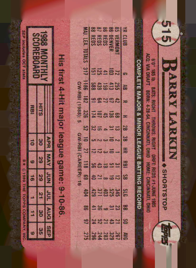This is a nice example of a 1989 Topps #515 Barry Larkin