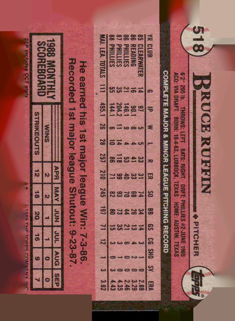 This is a nice example of a 1989 Topps #518 Bruce Ruffin