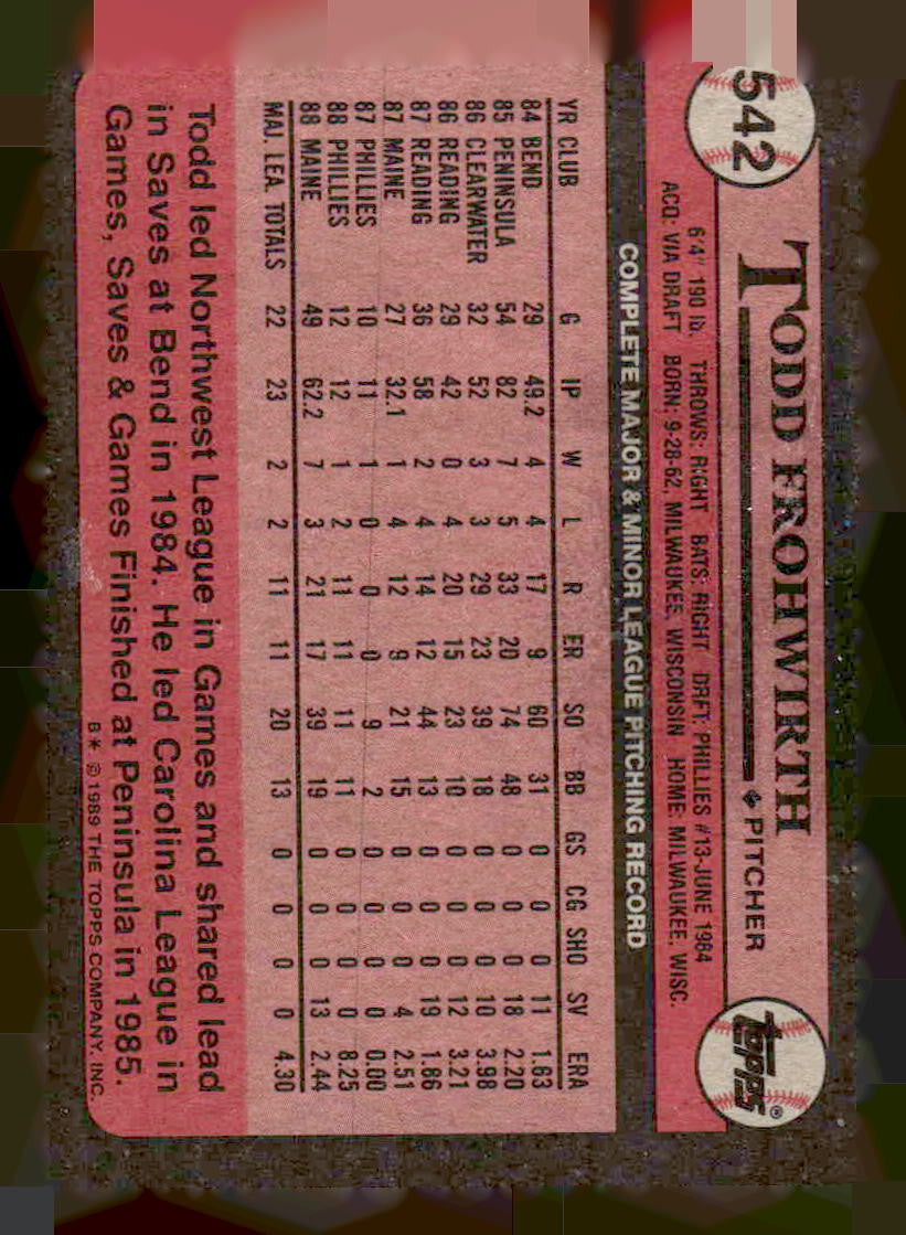 This is a nice example of a 1989 Topps #542 Todd Frohwirth