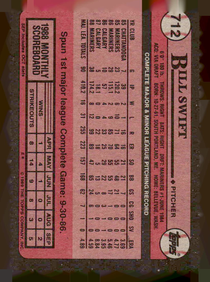 This is a nice example of a 1989 Topps #712 Bill Swift