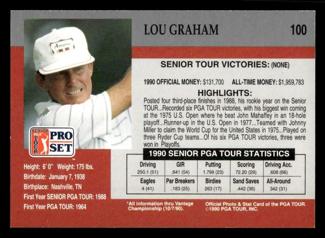 This is a nice example of a 1990 Pro Set PGA Tour #100 Lou Graham