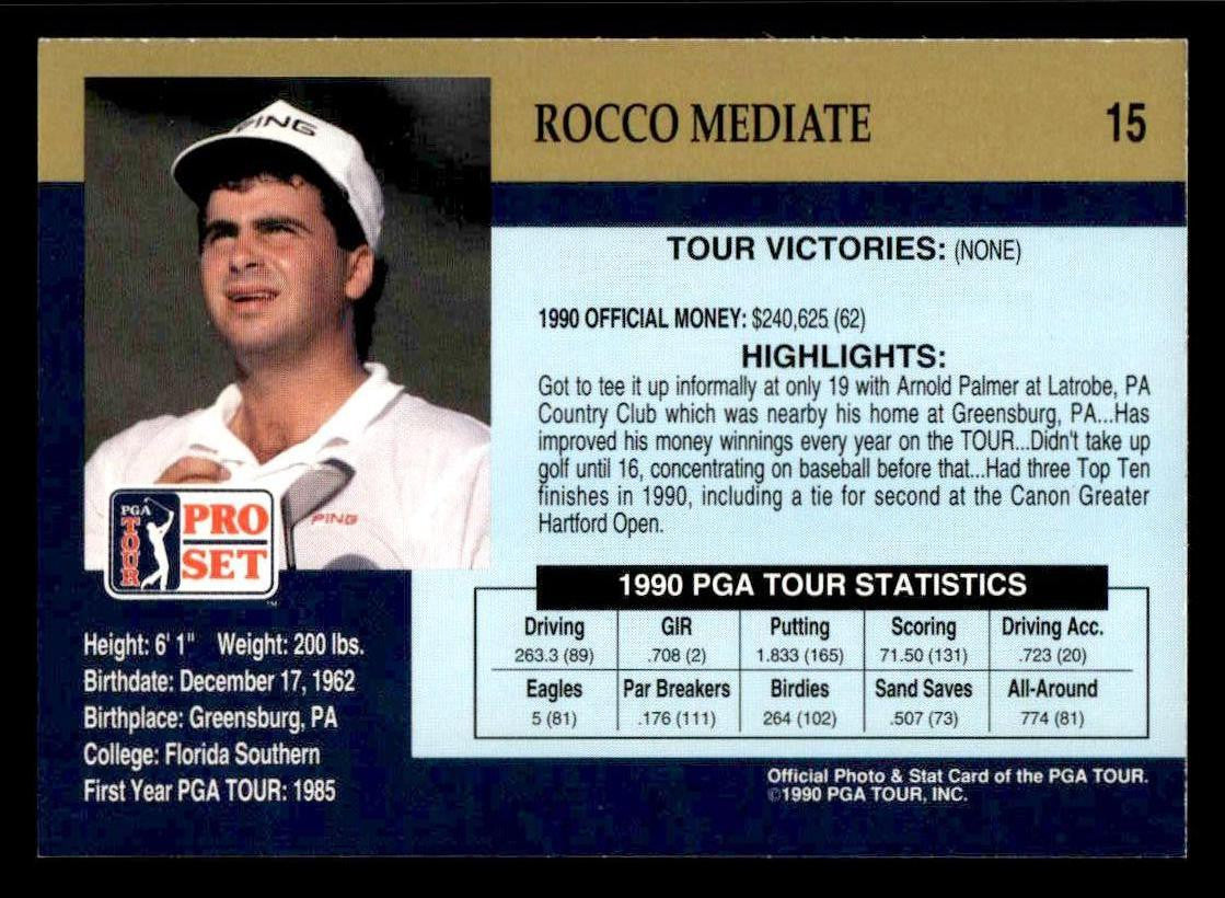 This is a nice example of a 1990 Pro Set PGA Tour #15 Rocco Mediate