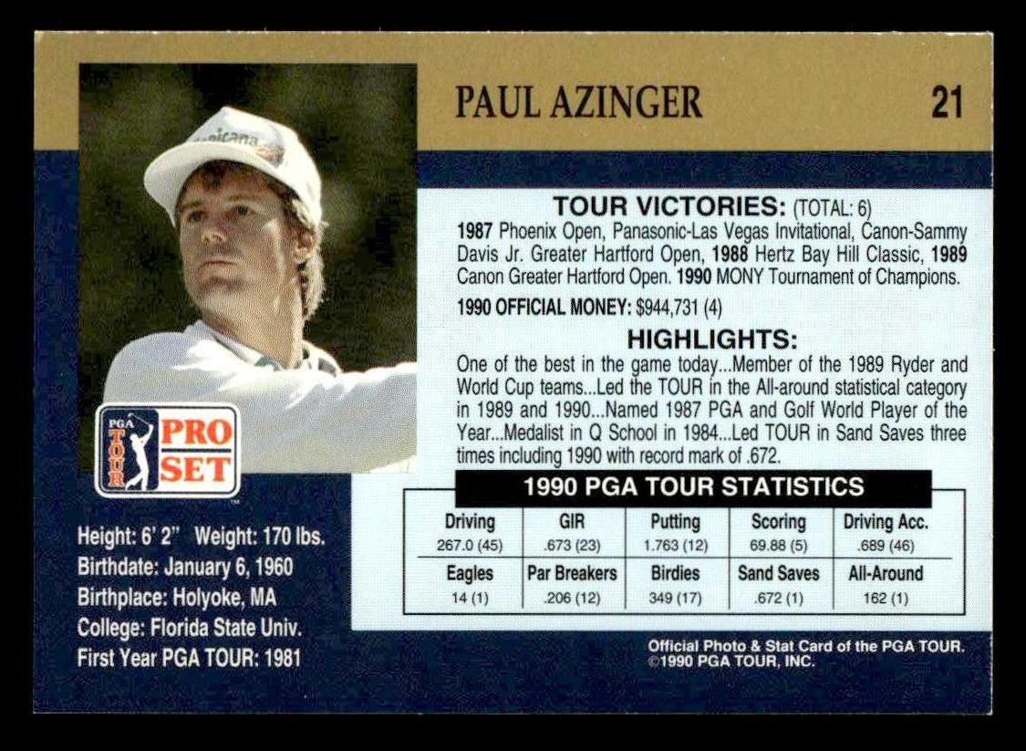 This is a nice example of a 1990 Pro Set PGA Tour #21 Paul Azinger