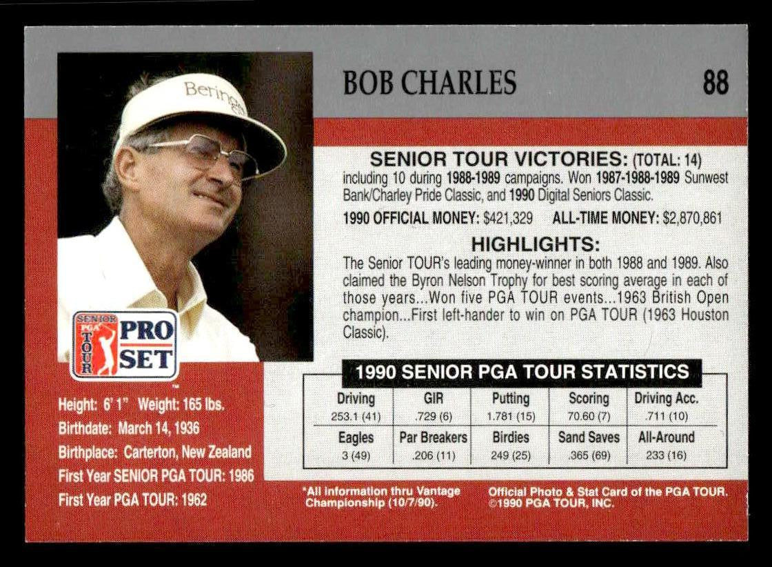 This is a nice example of a 1990 Pro Set PGA Tour #88 Bob Charles
