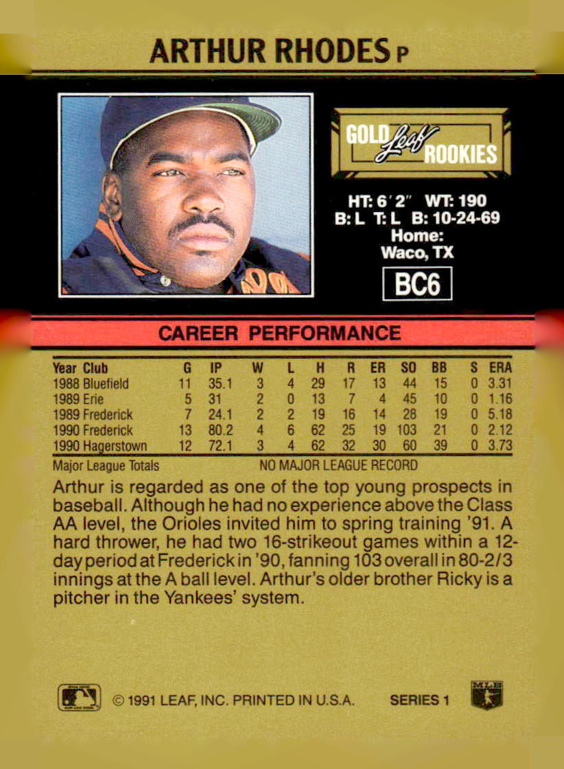 1991 Leaf #BC6 Arthur Rhodes Gold Rookies
