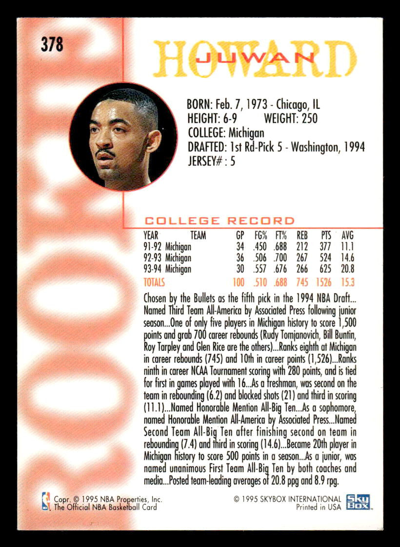 This is a nice example of a 1995 Skybox NBA Hoops #378 Juwan Howard