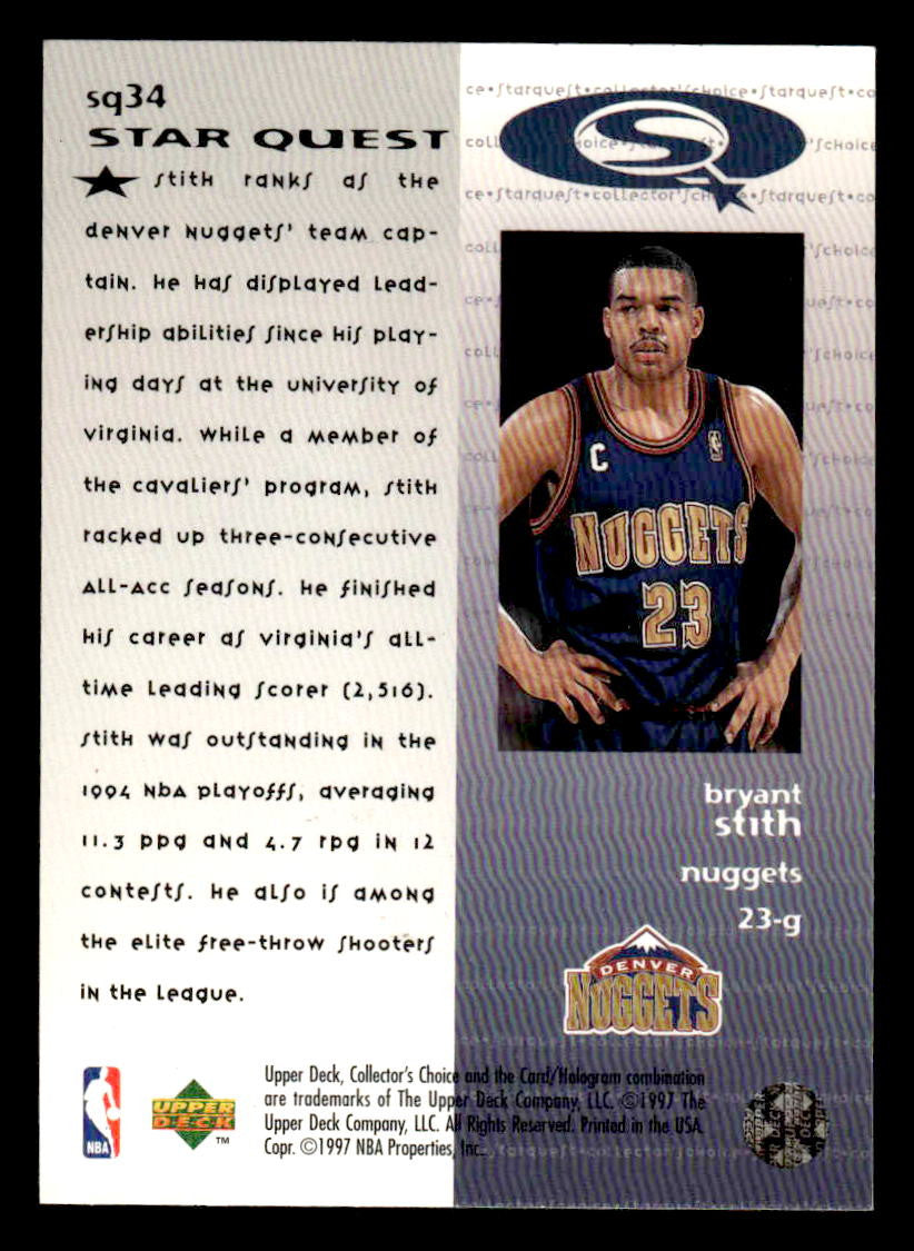 This is a nice example of a 1997-98 Collector's Choice #SQ34 Bryant Stith StarQuest