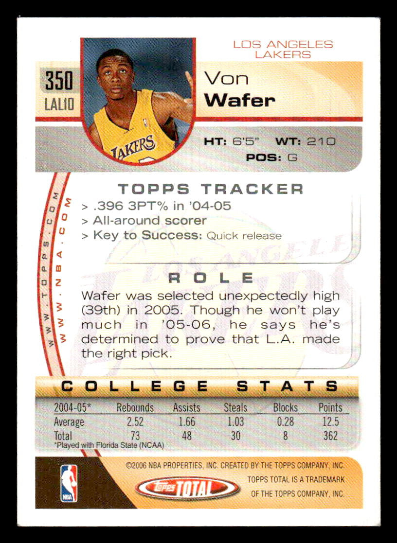 This is a nice example of a 2005-06 Topps Total #350 Von Wafer