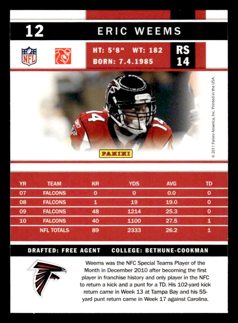 Eric Weems played for the Atlanta Falcons in 2011, and this card is a standout from the Score 2011 Score release. Whether you're chasing rookies, SSPs, or building a premium collection, this card delivers.