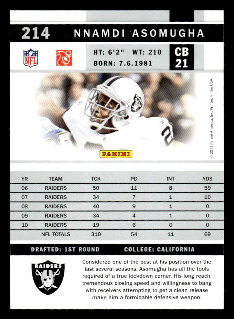 Nnamdi Asomugha played for the Oakland Raiders in 2011, and this card is a standout from the Score 2011 Score release. Whether you're chasing rookies, SSPs, or building a premium collection, this card delivers.