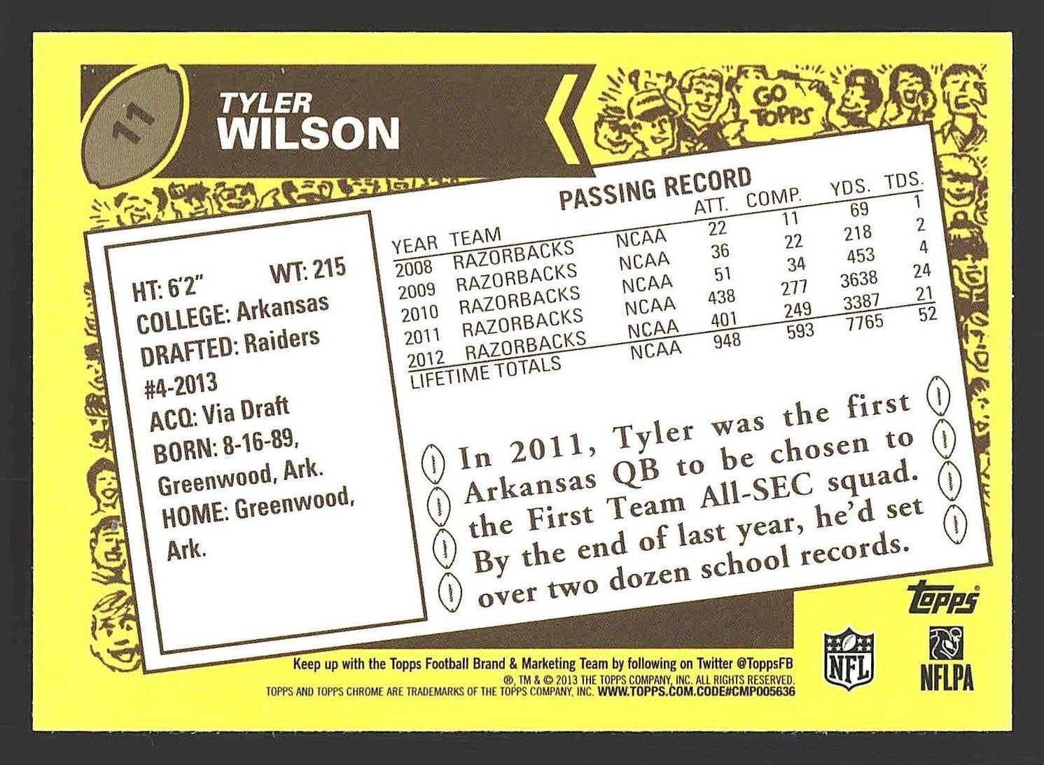 In 2013 Tyler Wilson played for the Oakland Raiders.