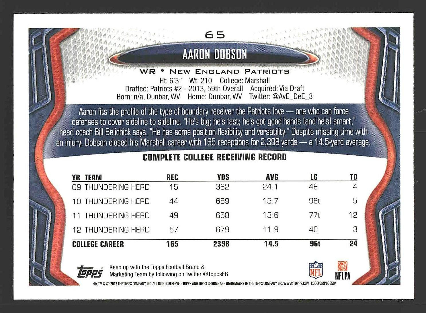 In 2013 Aaron Dobson played for the New England Patriots.