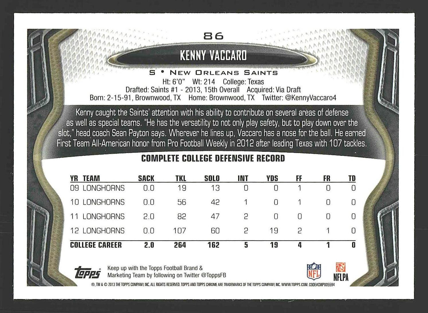This is a nice example of a 2013 Topps Chrome #86 Kenny Vaccaro
