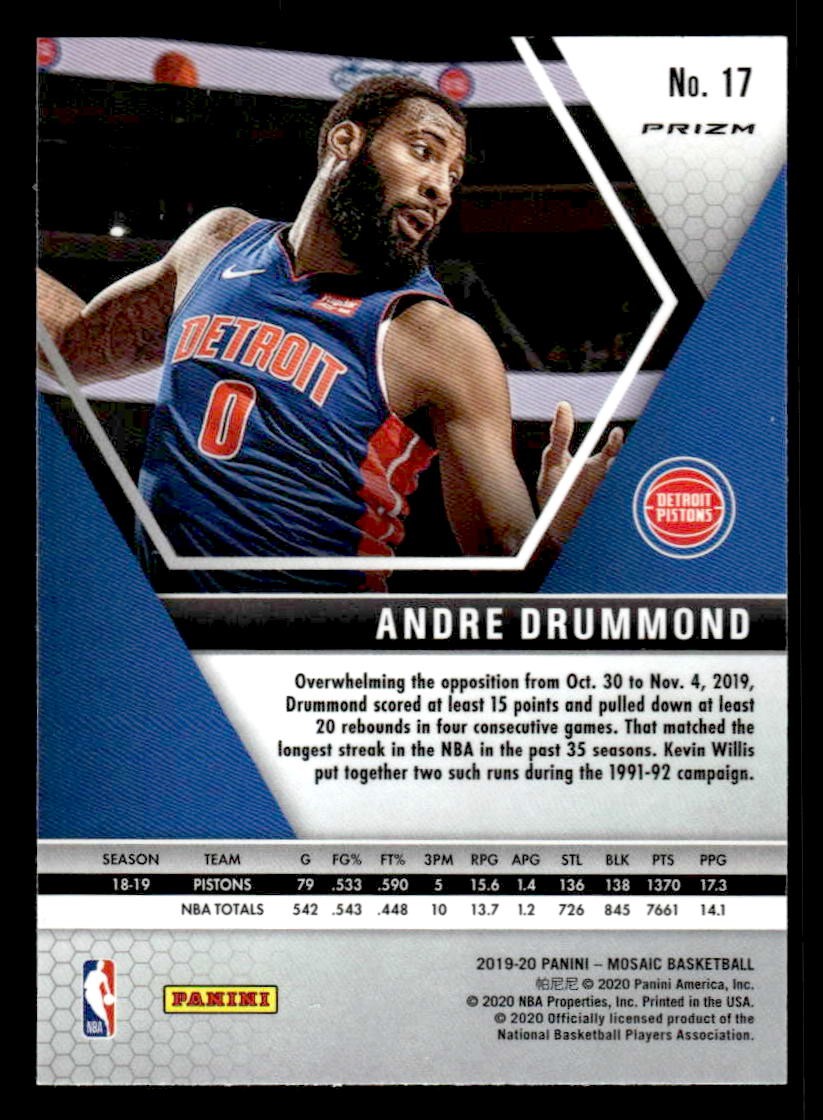 This is a nice example of a 2019-20 Panini Mosaic #17 Andre Drummond Silver Prizm