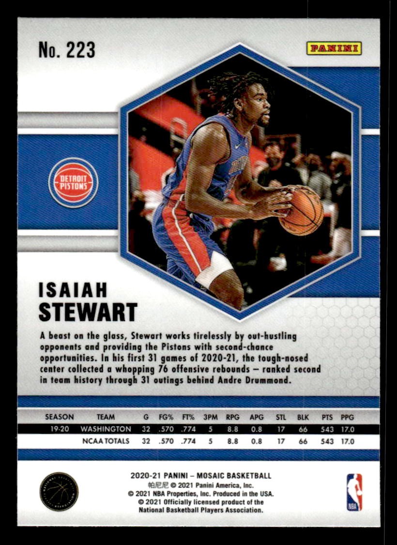 This is a nice example of a 2020-21 Panini Mosaic #223 Isaiah Stewart