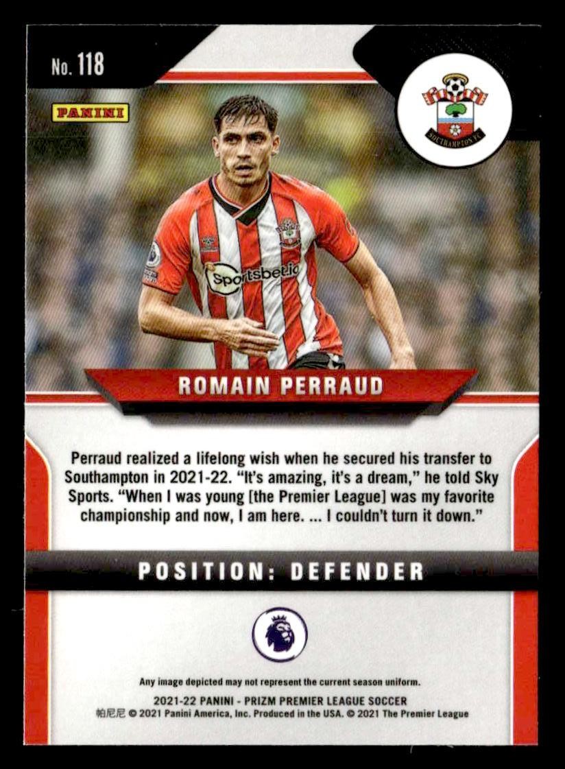 This is a sharp example of the 2021-22 Panini Prizm Premier League #118 featuring Romain Perraud.