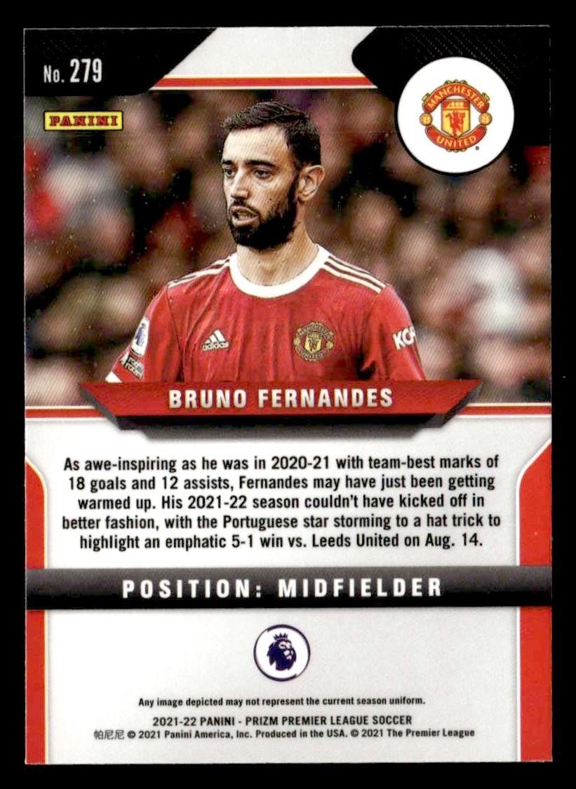 This is a sharp example of the 2021-22 Panini Prizm Premier League #279 featuring Bruno Fernandes.
