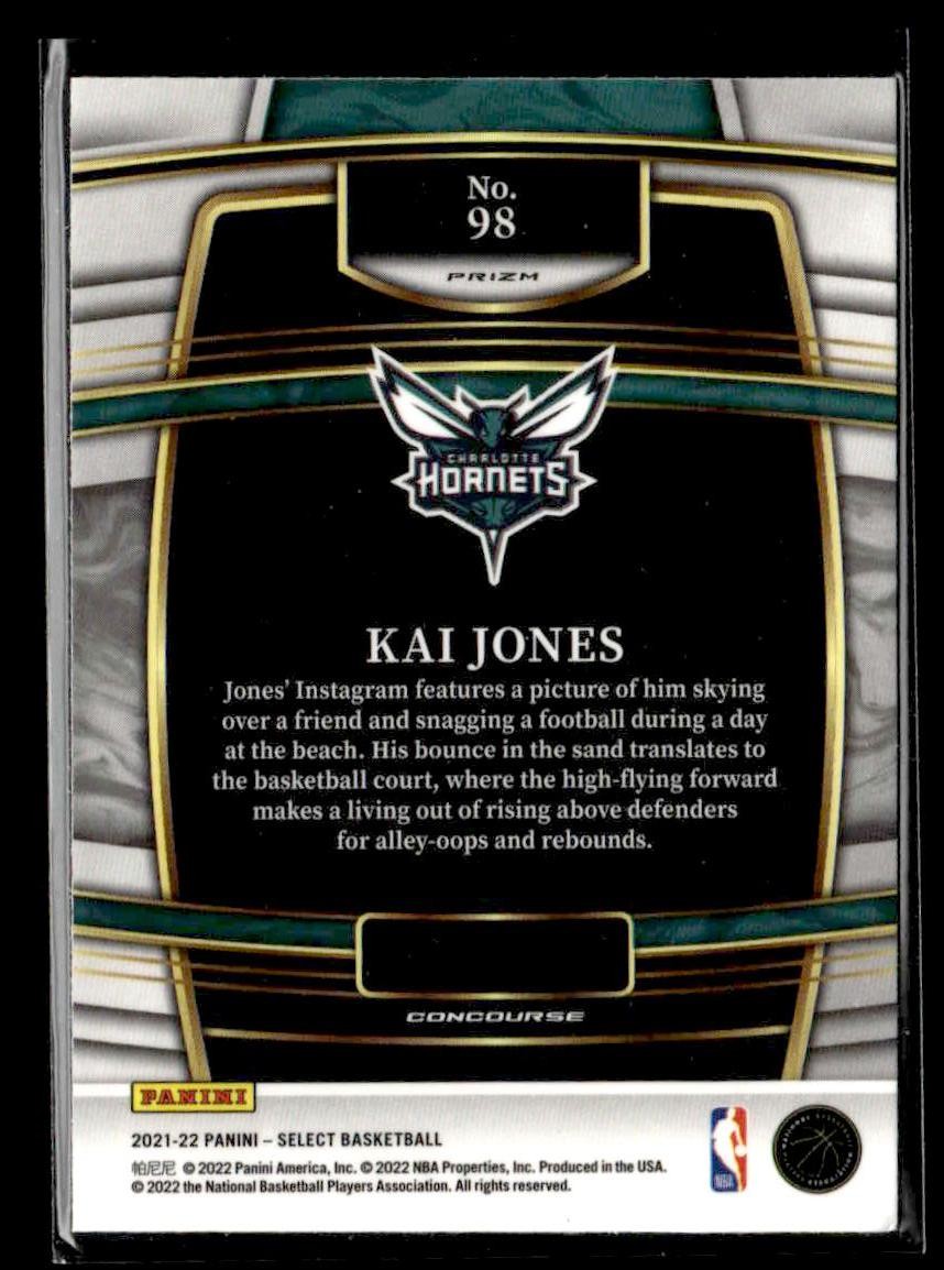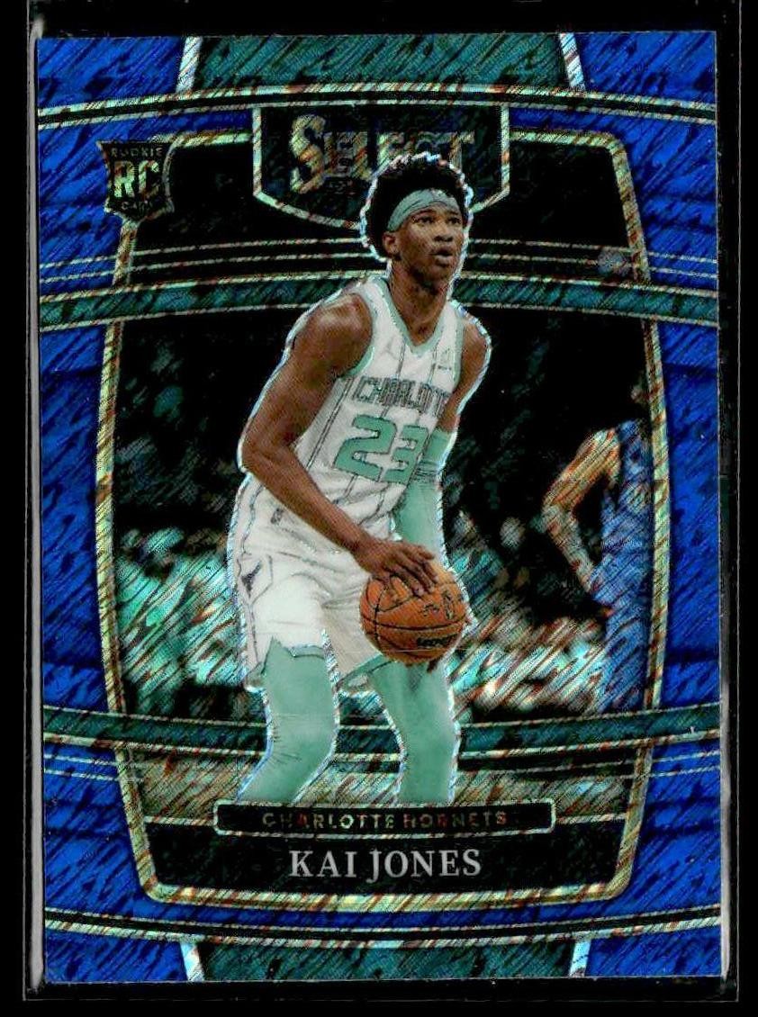 This is a nice example of a 2021-22 Panini Select #98 Kai Jones Blue Shimmer Prizms