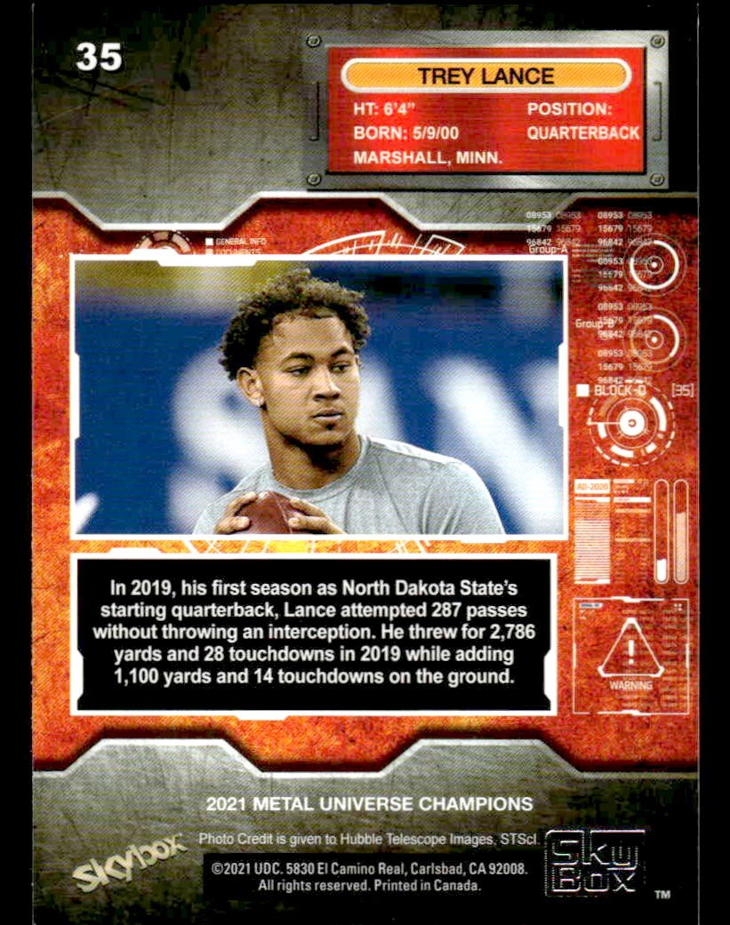 This is a nice example of a 2021 SkyBox Metal Universe Champions #35 Trey Lance Spectrum