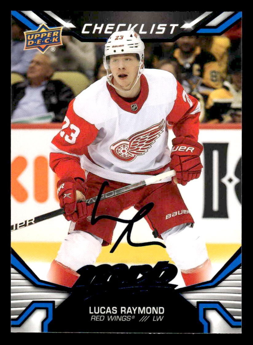 This is a nice example of a 2022-23 Upper Deck MVP #100 Lucas Raymond Blue Script