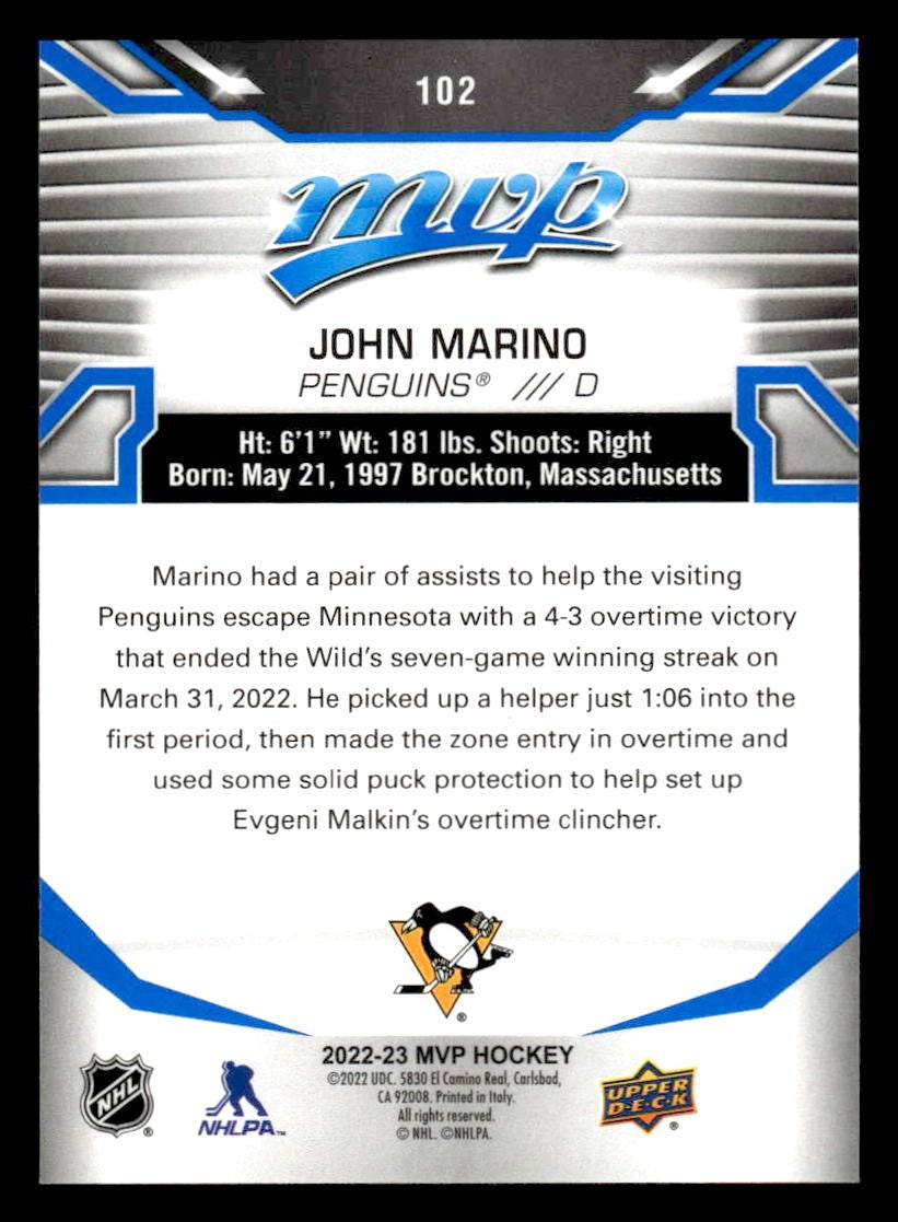 This is a nice example of a 2022-23 Upper Deck MVP #102 John Marino Blue Script