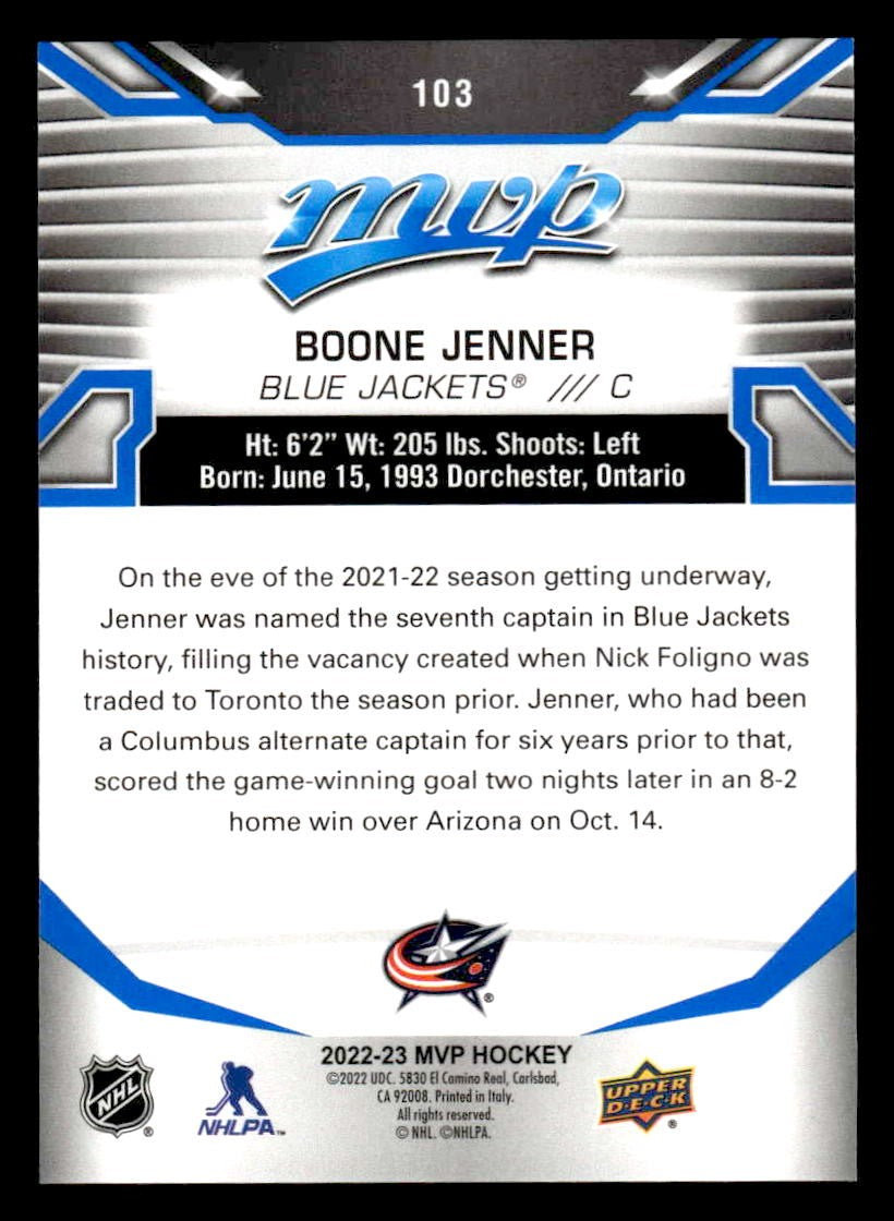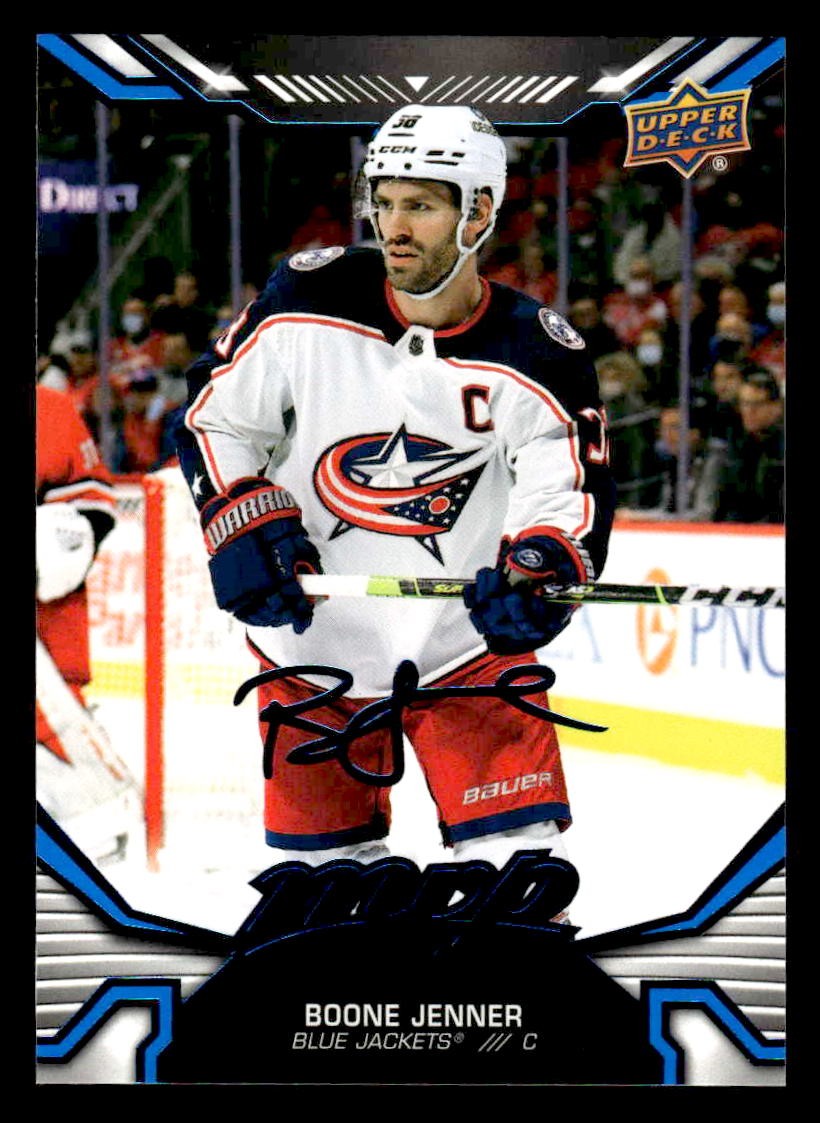 This is a nice example of a 2022-23 Upper Deck MVP #103 Boone Jenner Blue Script
