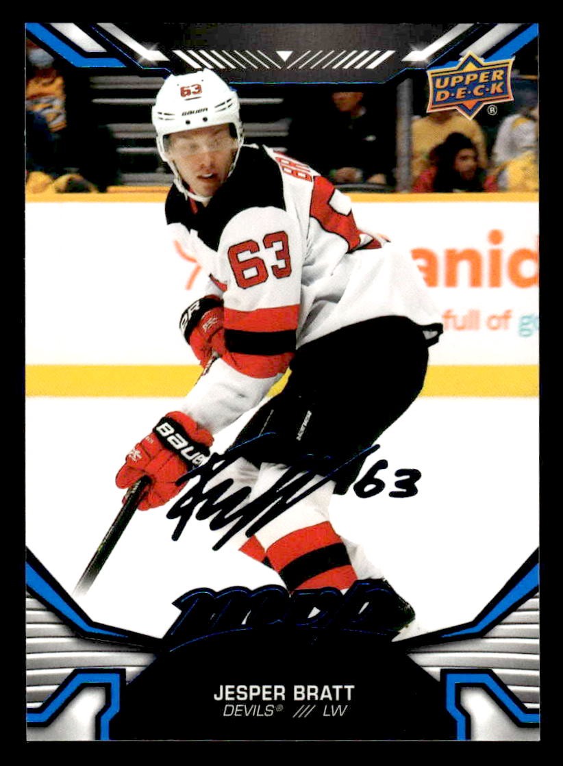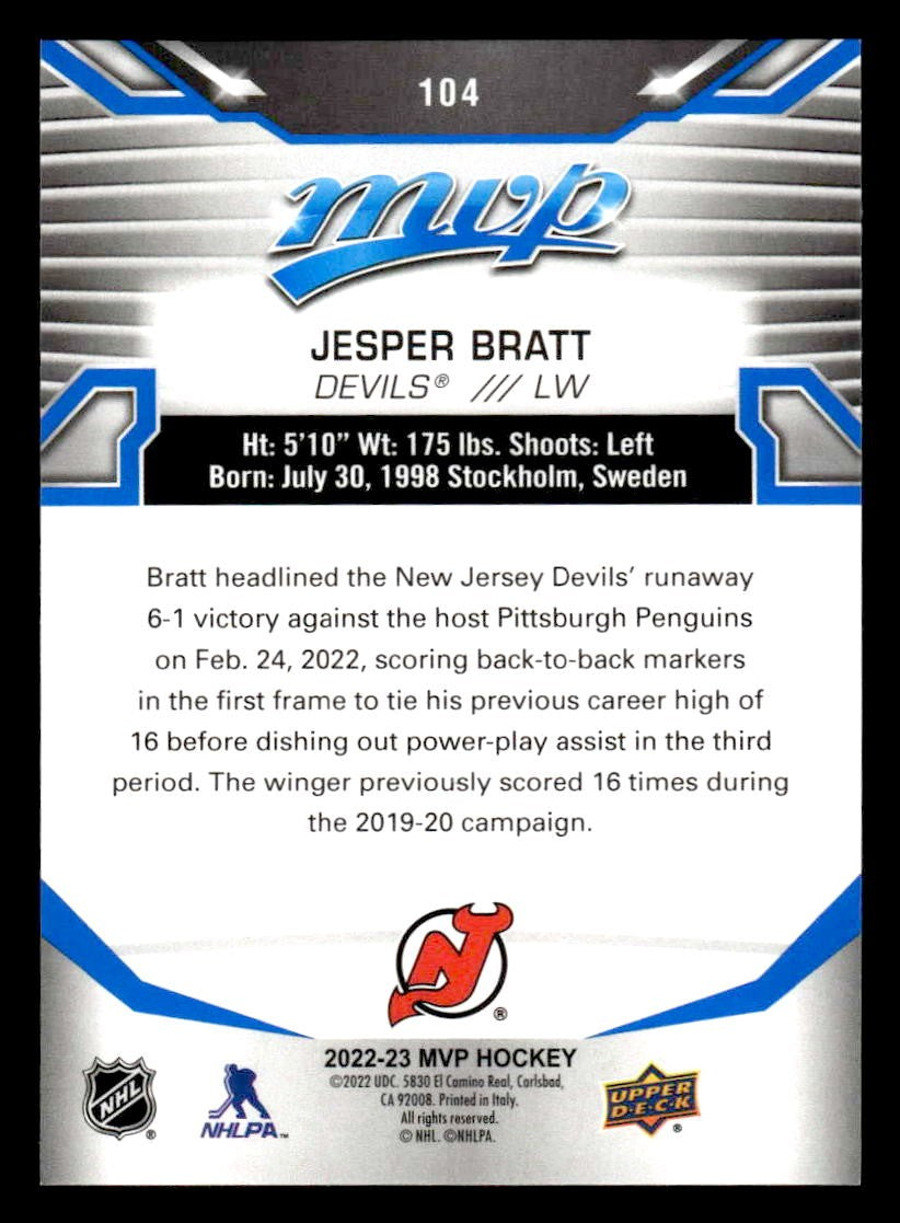 This is a nice example of a 2022-23 Upper Deck MVP #104 Jesper Bratt Blue Script