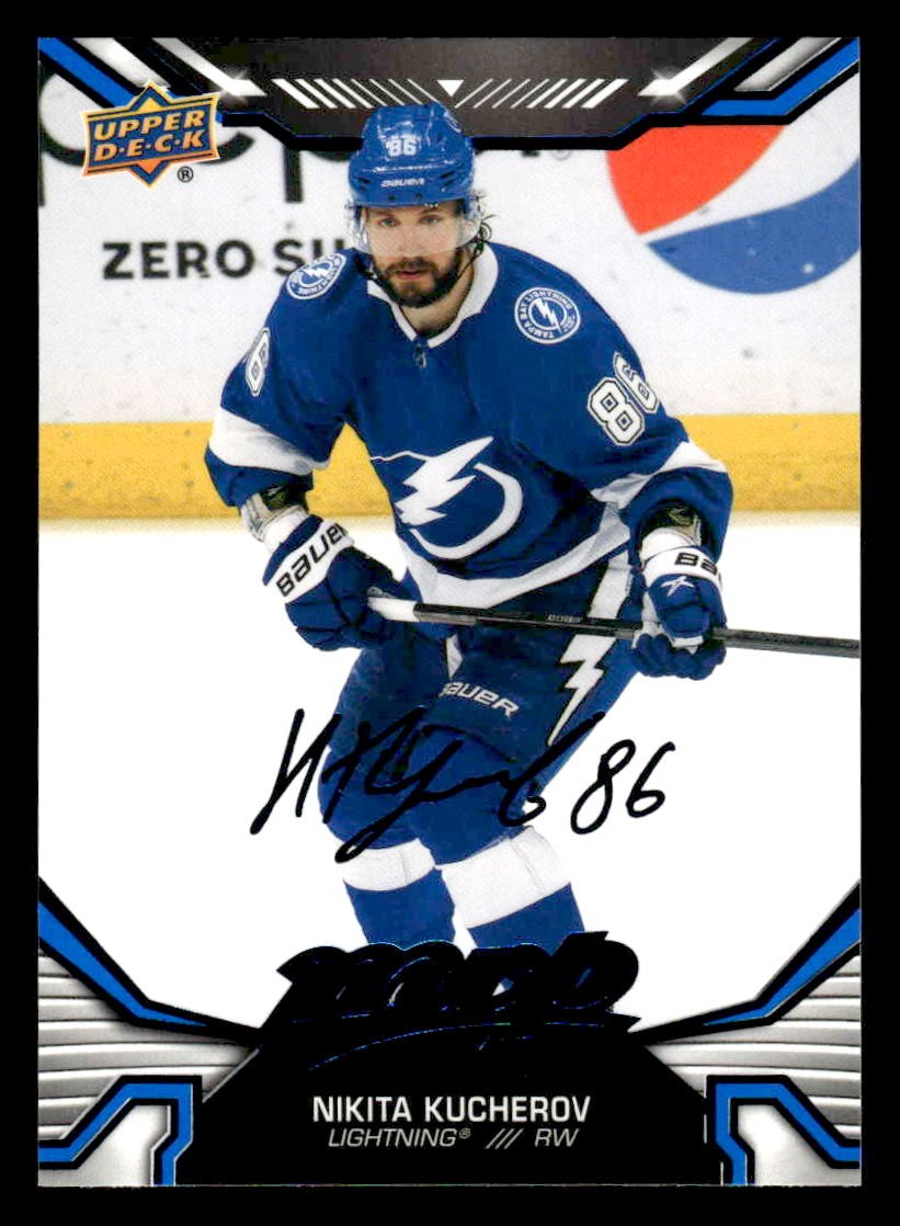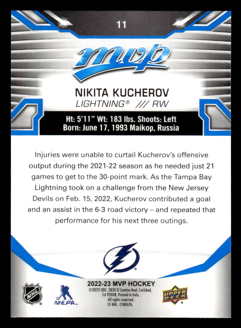 This is a nice example of a 2022-23 Upper Deck MVP #11 Nikita Kucherov Blue Script