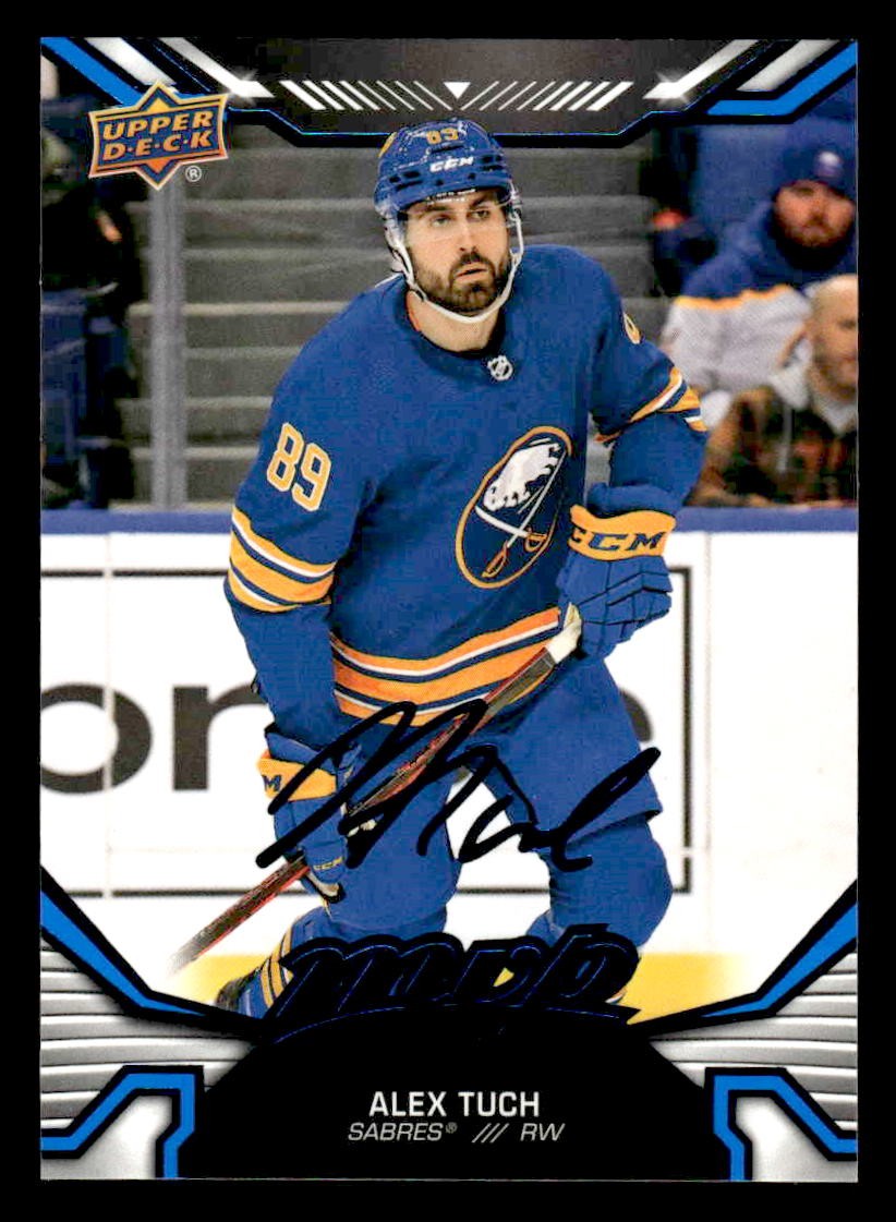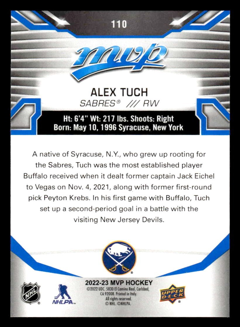 This is a nice example of a 2022-23 Upper Deck MVP #110 Alex Tuch Blue Script