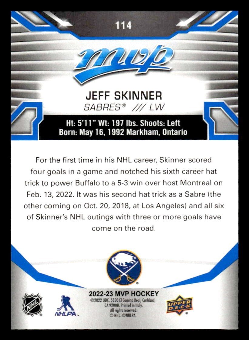 This is a nice example of a 2022-23 Upper Deck MVP #114 Jeff Skinner Blue Script