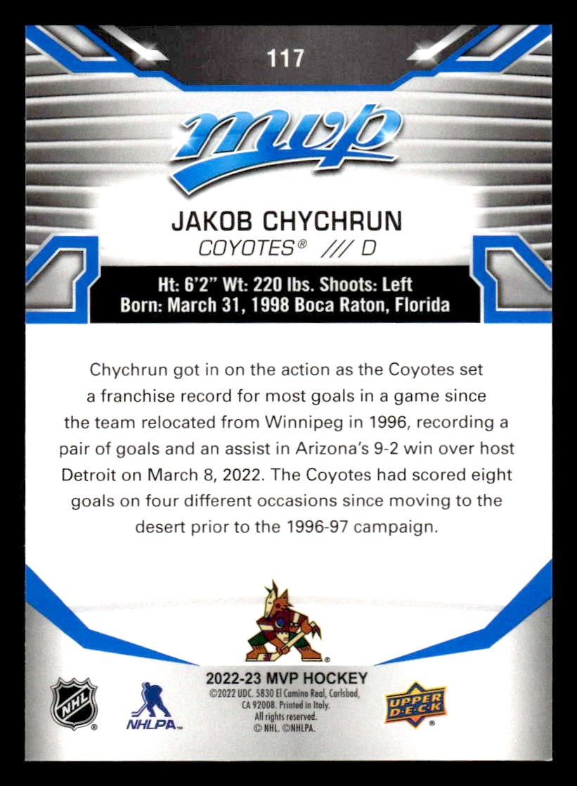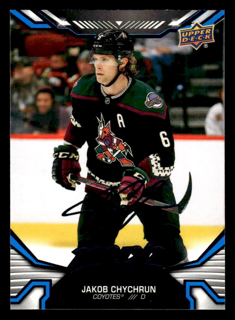 This is a nice example of a 2022-23 Upper Deck MVP #117 Jakob Chychrun Blue Script