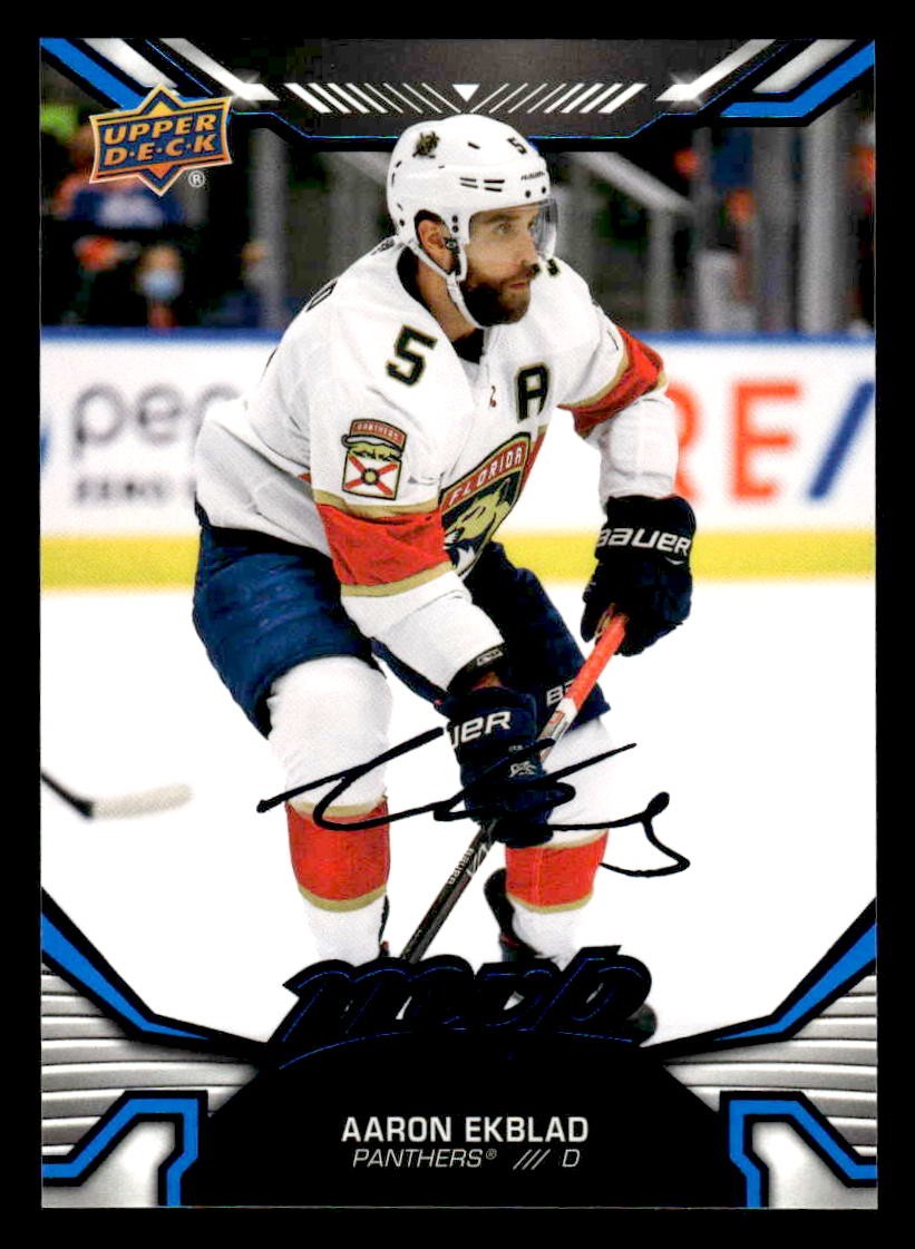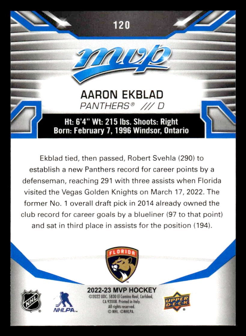 This is a nice example of a 2022-23 Upper Deck MVP #120 Aaron Ekblad Blue Script