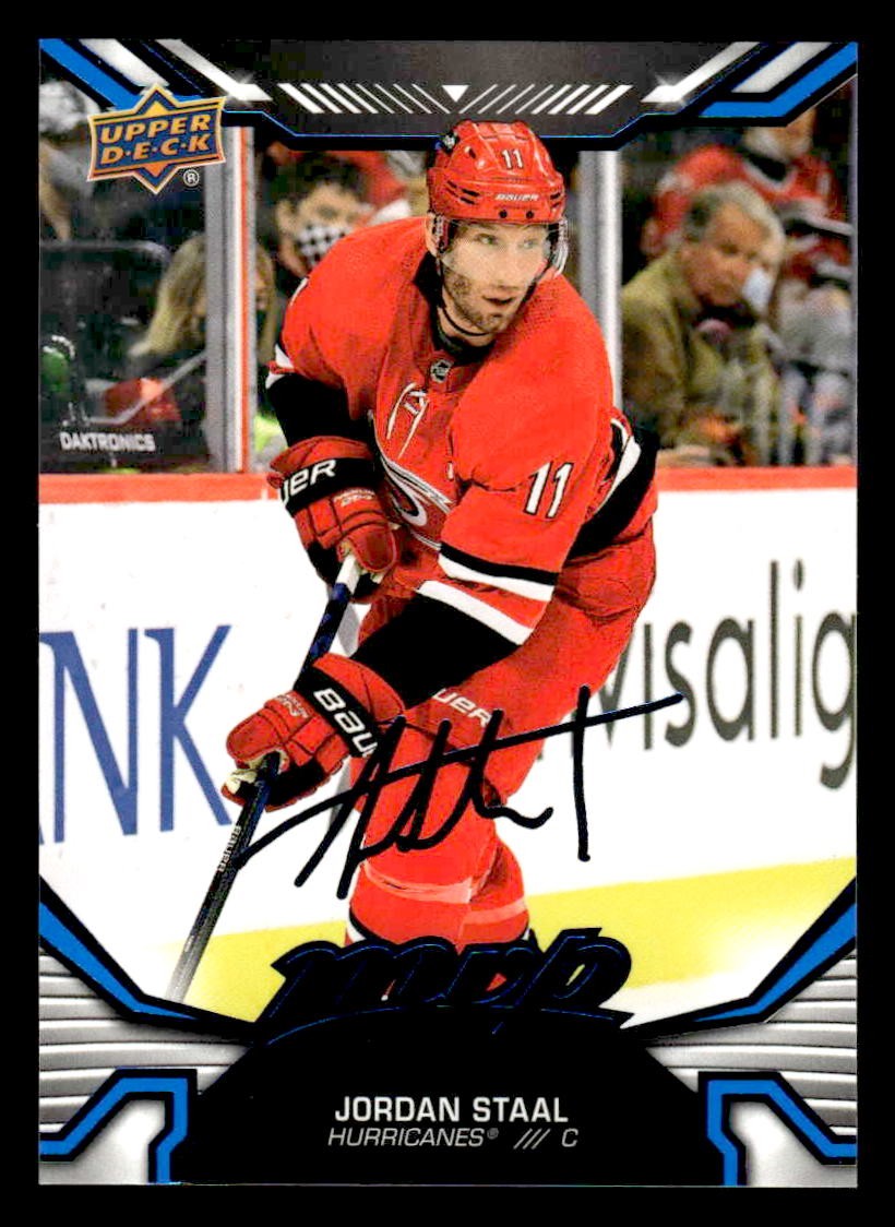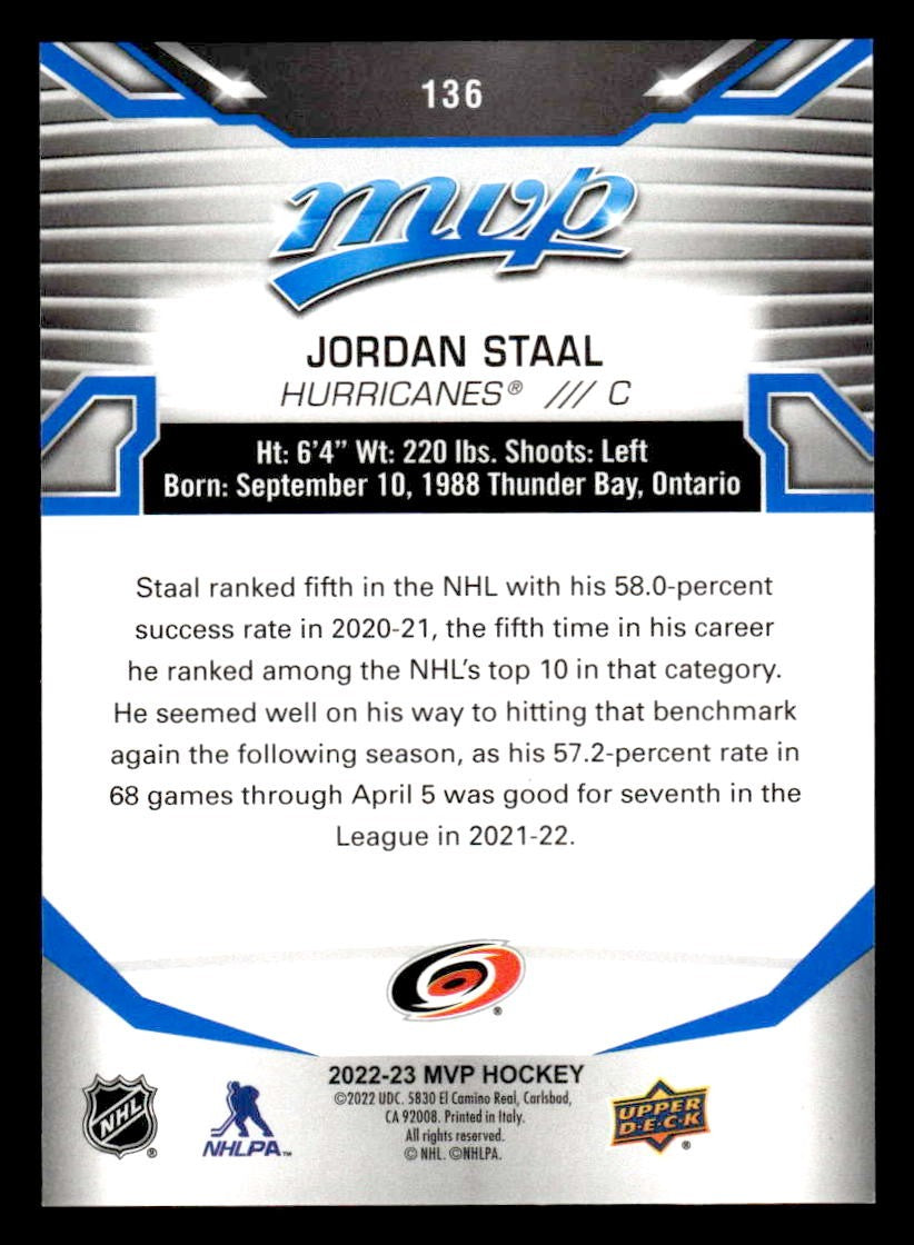 This is a nice example of a 2022-23 Upper Deck MVP #136 Jordan Staal Blue Script